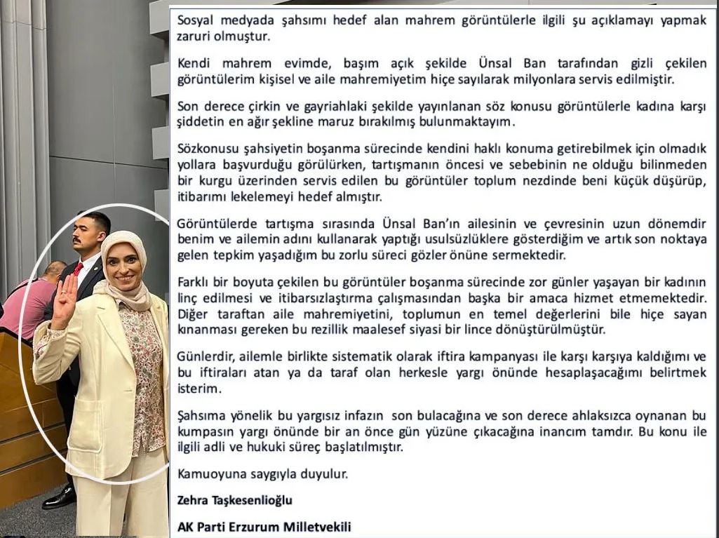Zehra Taşkesenlioğlu'nun evinde çekilen bir videosu gündeme bomba gibi düştü. Erzurum Milletvekili Zehra Taşkesenlioğlu'nun bu videosunu çeken isim ise Ünsal Ban çıktı. Zehra Taşkesenlioğlu, 2009 yılında Ünsal Ban ile evlenmişti. Zehra Taşkesenlioğlu eşi Ünsal Ban'dan boşanmak isteyince ortalık karıştı. Ünsal Ban'ın eşini başı açık bir şekilde evlerinde çektiği video sosyal medyaya düşünce gündeme oturdu.