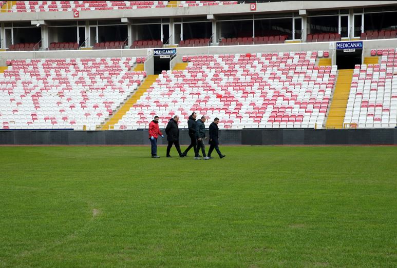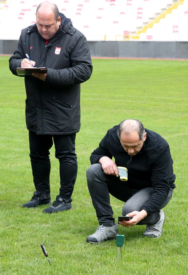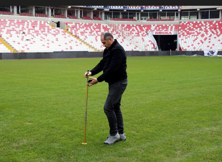Sivas 4 Eylül Stadyumu zeminindeki bakım çalışmalarının ardından Türkiye Futbol Federasyonu (TFF) çim zemin denetçisi Erhan Akbağ, stadyumu inceledi. Zemindeki çimleri kontrol eden Akbağ, bazı ölçümler gerçekleştirdi.