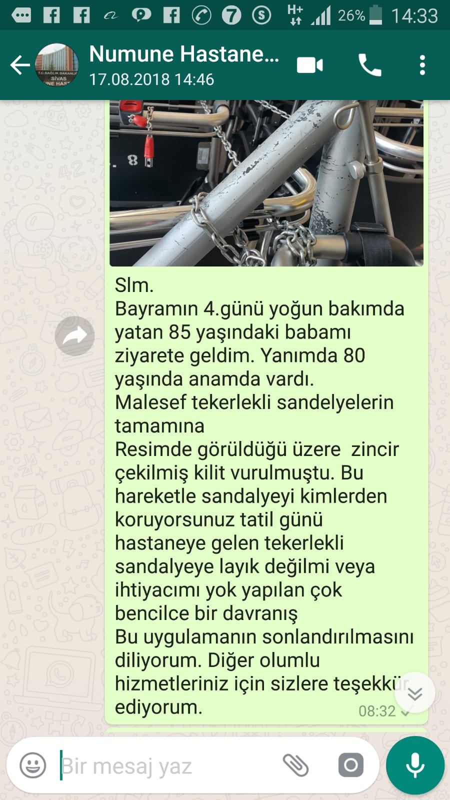 Büyük Sivas WhatsApp Haber Hattı (0555 898 15 58)'na Sivas'ta yaşanan her türlü sıkıntılar iletilmeye devam ediyor. Sivas Numune Hastanesi'nde geçtiğimiz günlerde yaşanan bir olay akıllara durgunluk verdi. Hastanede ki tekerlekli sandalyeler zincirlendi...