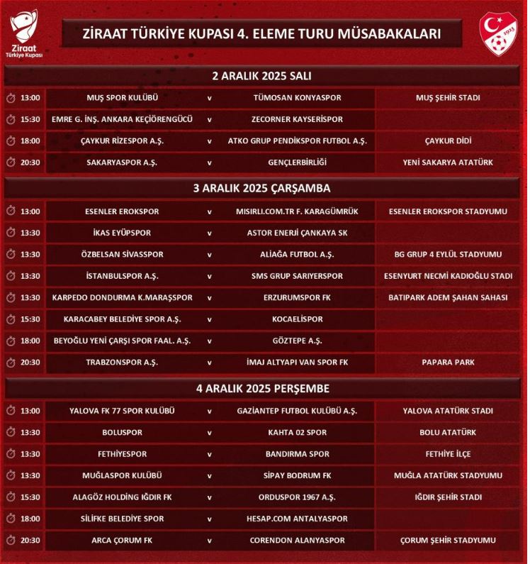 Açıklanan programa göre Ziraat Türkiye Kupası 4. eleme turu fikstürü şöyle: