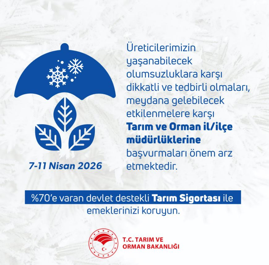 Üreticilere Kritik Tarih Aralığı Hatırlatıldı.. Tarım ve Orman Bakanlığı tarafından yapılan açıklamada, 7-11 Nisan 2026 tarihleri arasında ülke genelinde bazı bölgelerde etkili olması beklenen olumsuz hava koşullarının tarımsal üretim açısından risk oluşturabileceği bildirildi.