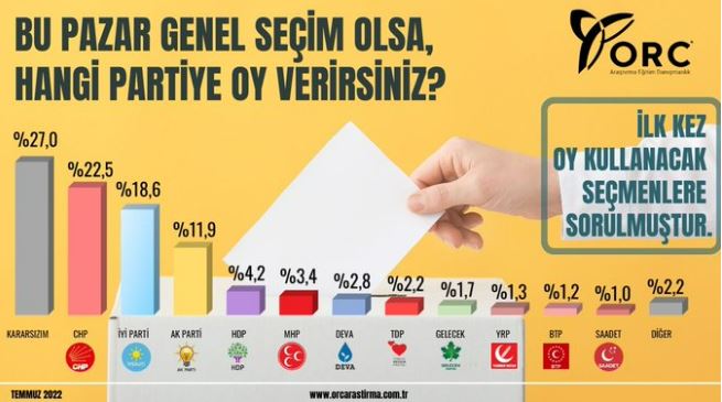 24-29 Temmuz 2022 tarihleri arasında 51 ilde, ilk kez oy kullanacak toplam 2185 kişi ile yüz yüze görüşülerek gerçekleştirilen araştırmanın sonucuna göre, bu pazar genel seçim olsa seçmenin oy davranışının ne olacağı soruldu.