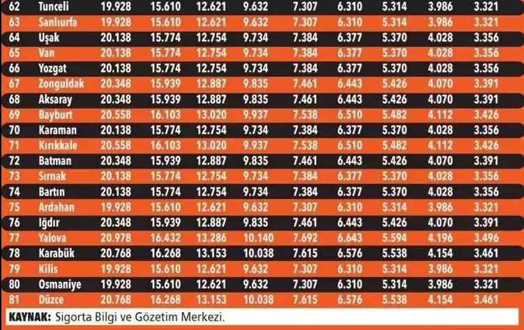 Sigorta Bilgi ve Gözetim Merkezi, 1 Ocak’tan itibaren geçerli tavan tarifelerin bulunduğu güncel tabloyu yayınladı.